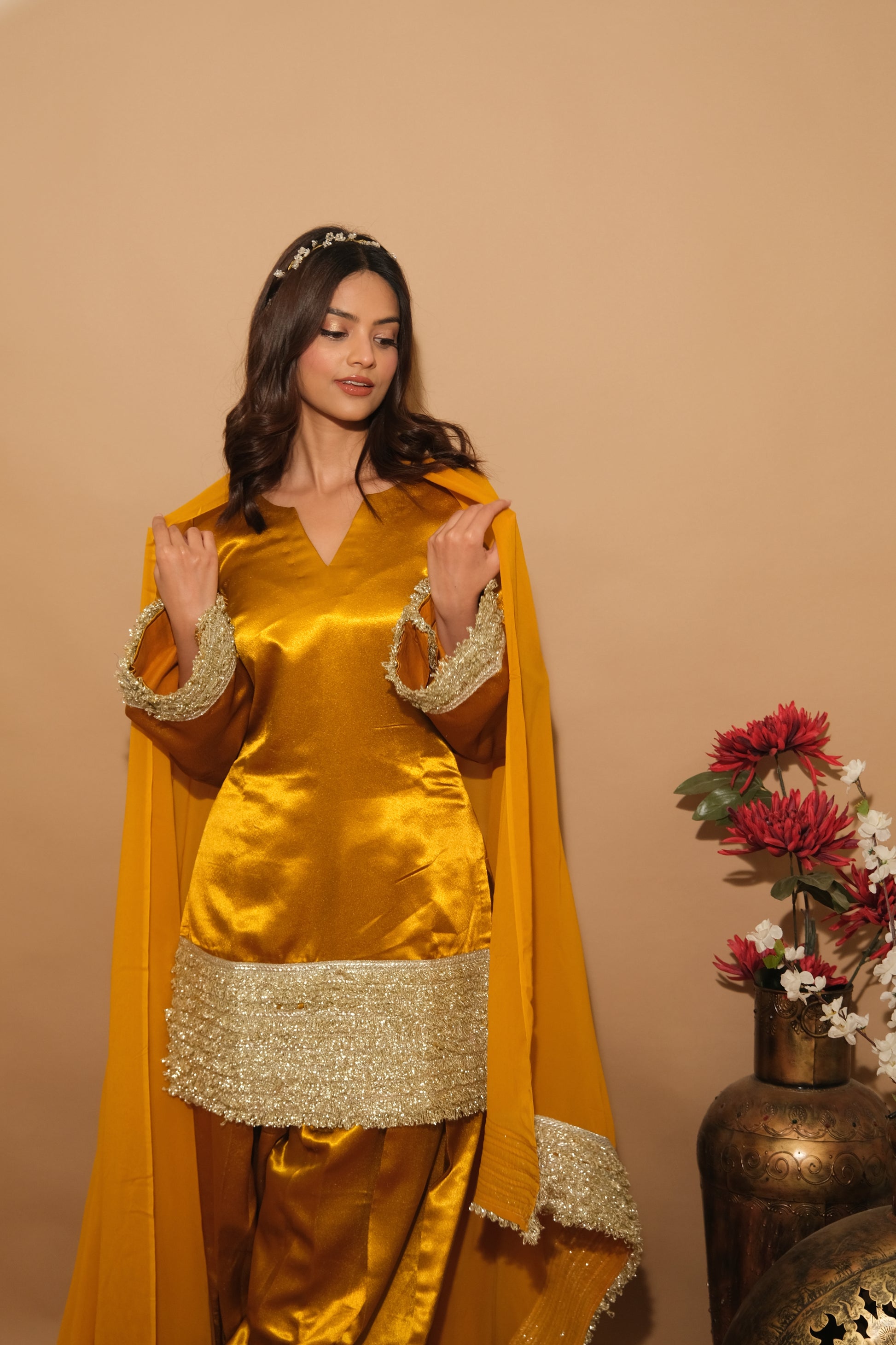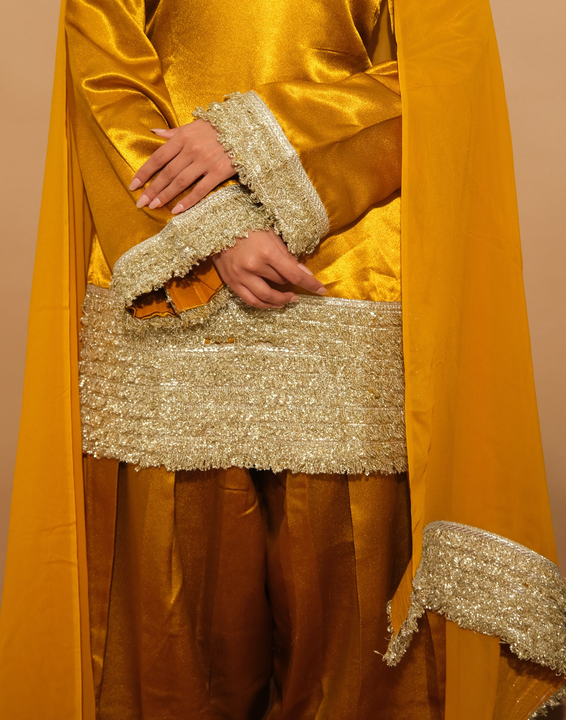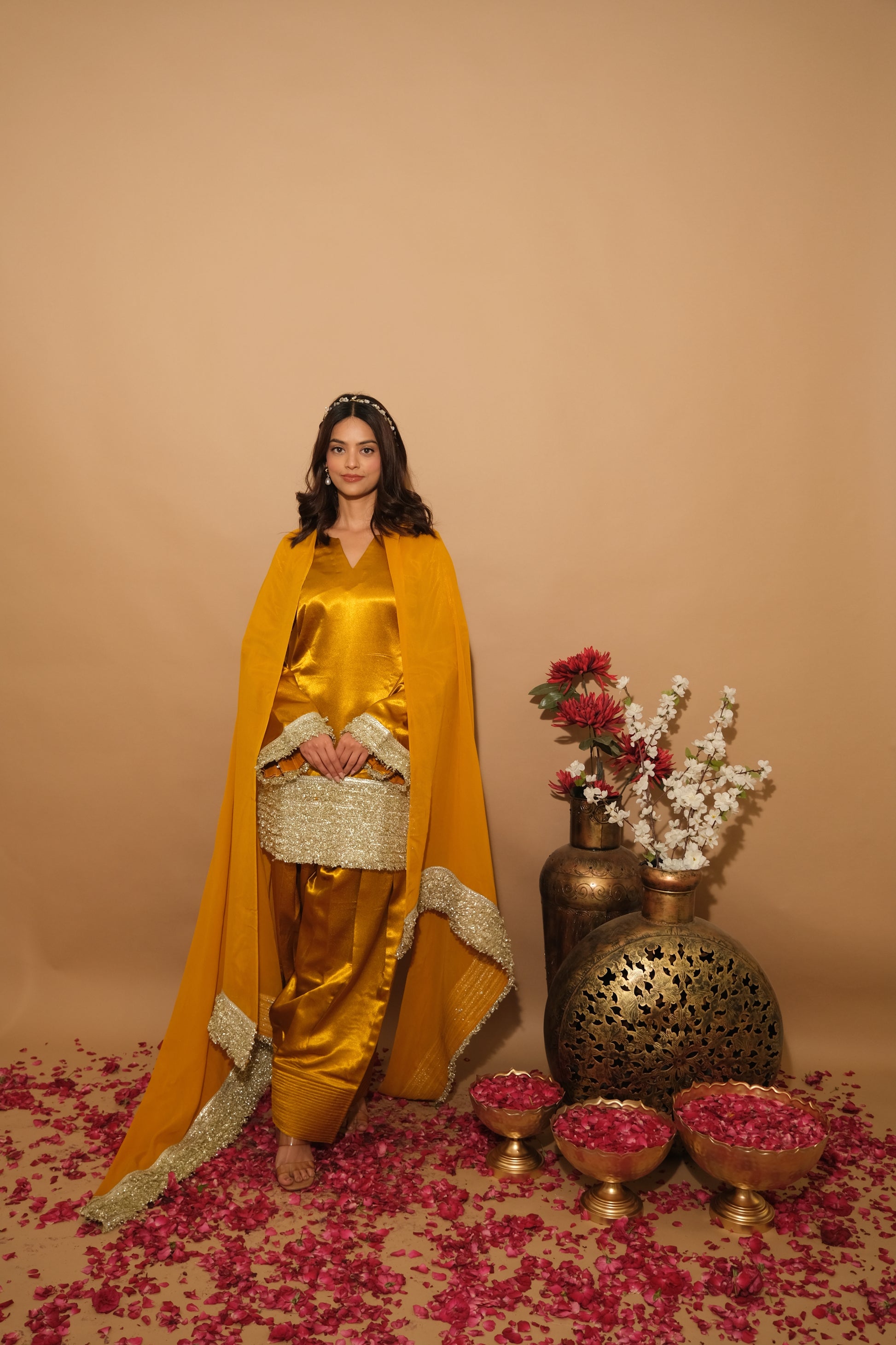 Grounded in earthy tones with golden accents, Elvora evokes natural beauty and timeless sophistication. The rich fabric and artisan reflect an organic elegance, ideal for cultural celebrations.