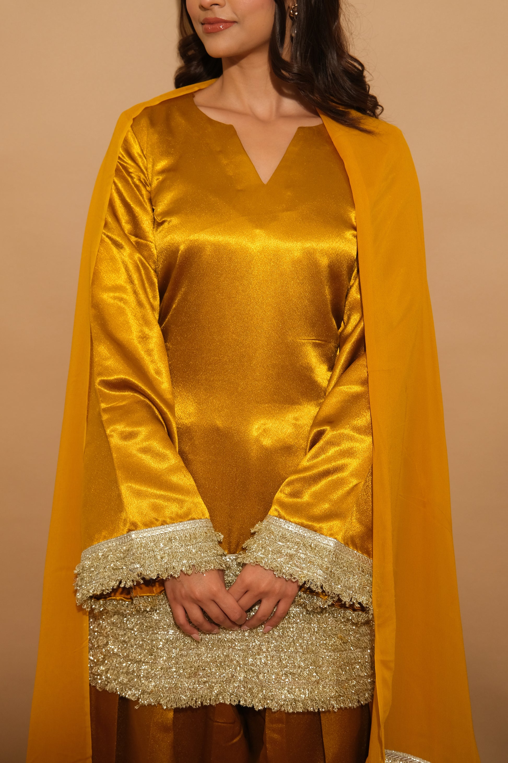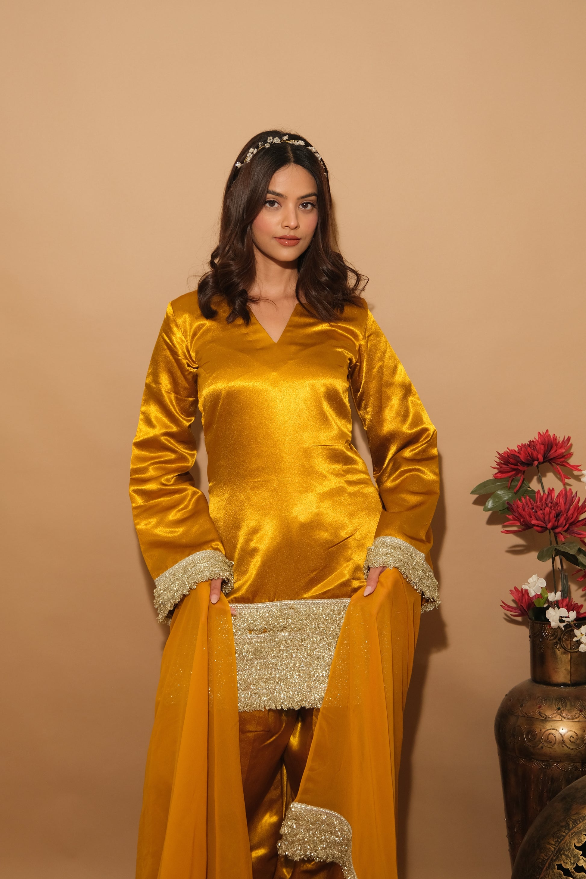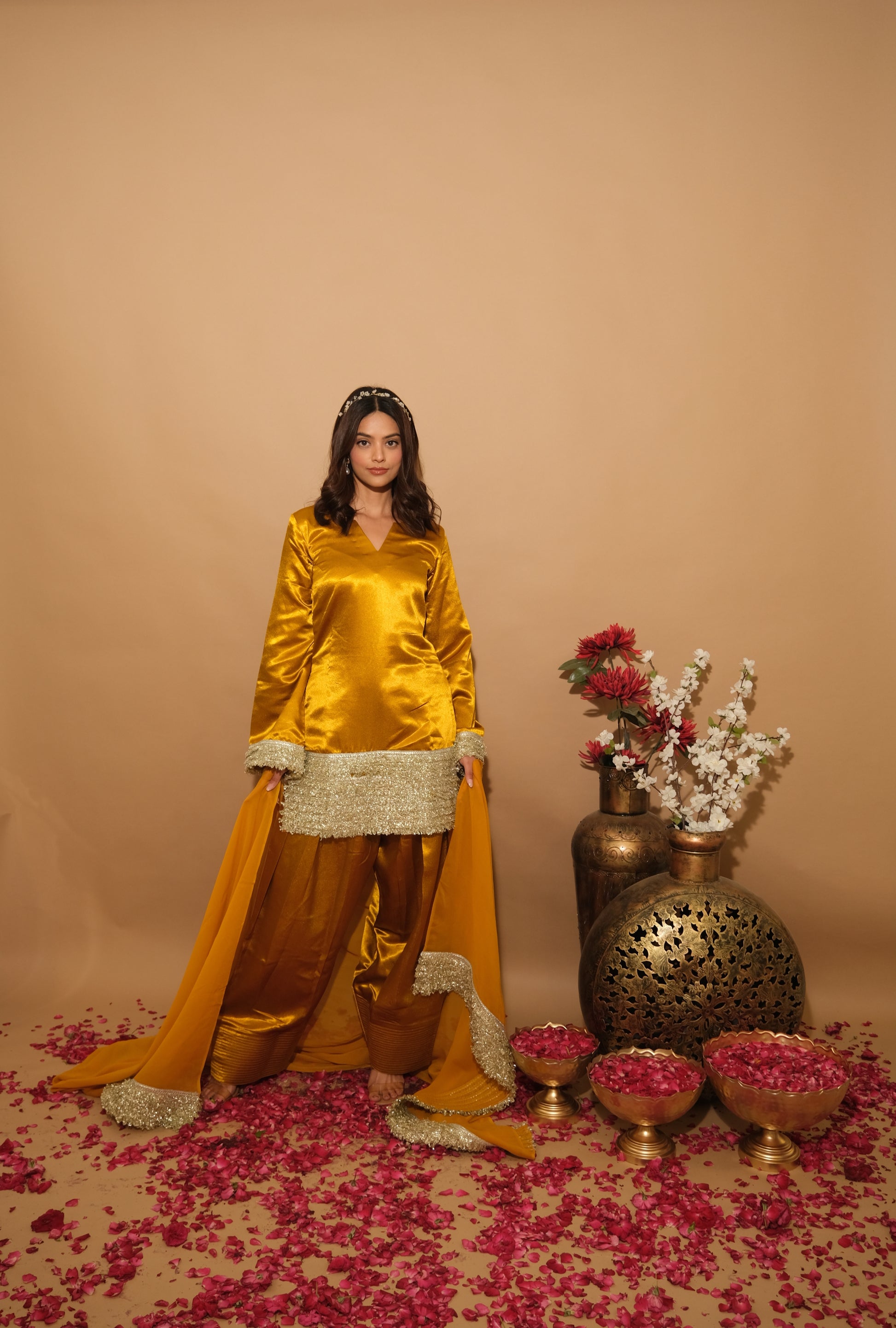 Grounded in earthy tones with golden accents, Elvora evokes natural beauty and timeless sophistication. The rich fabric and artisan reflect an organic elegance, ideal for cultural celebrations.
