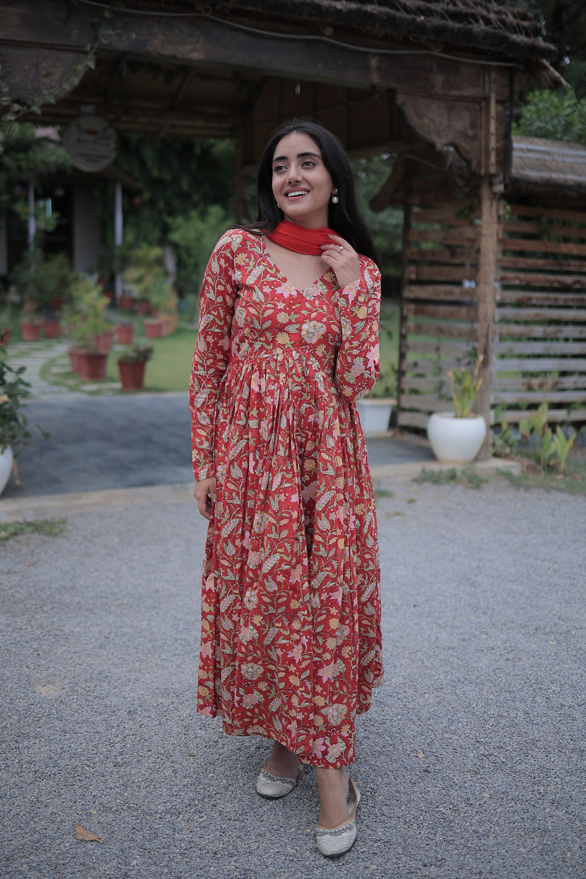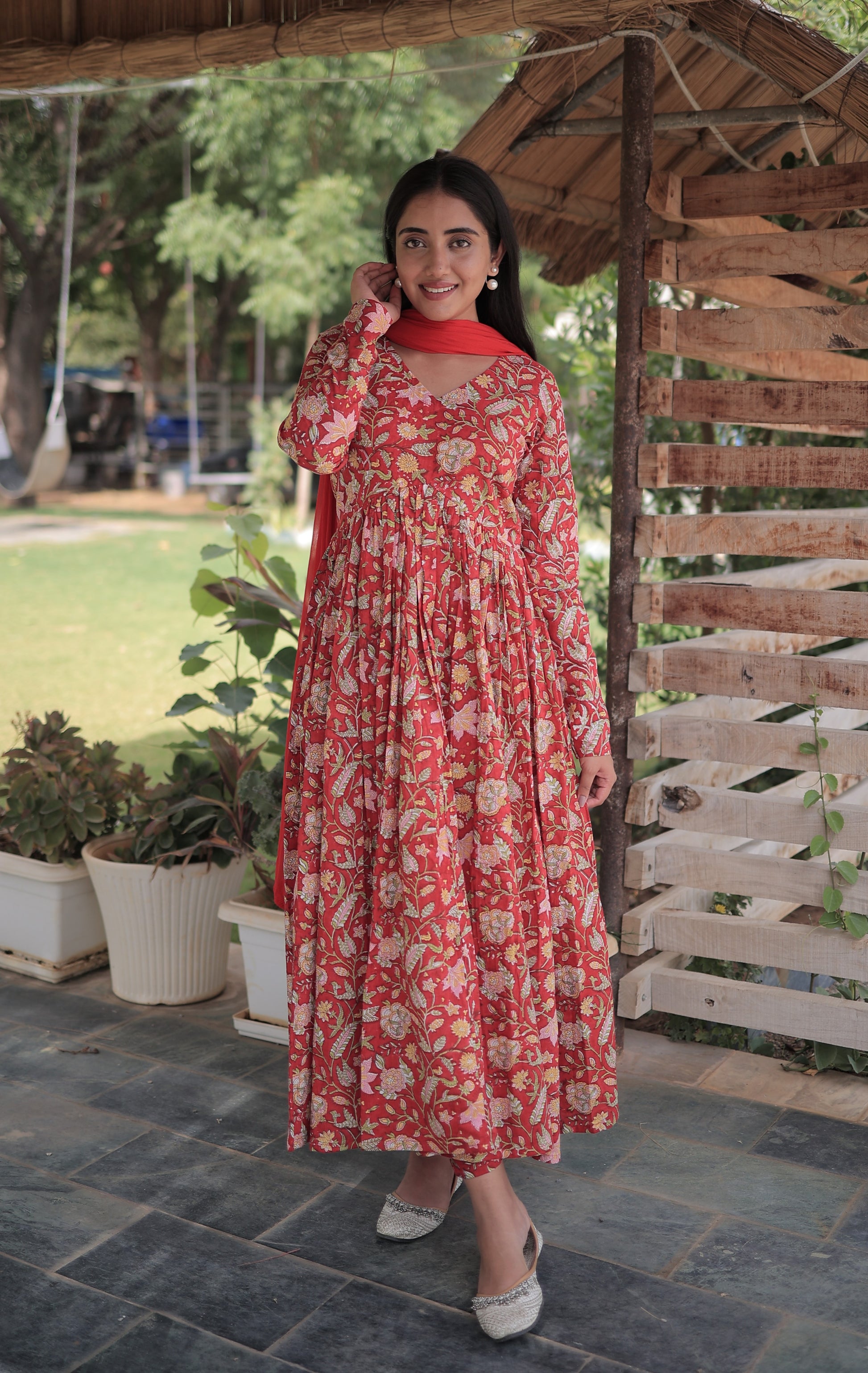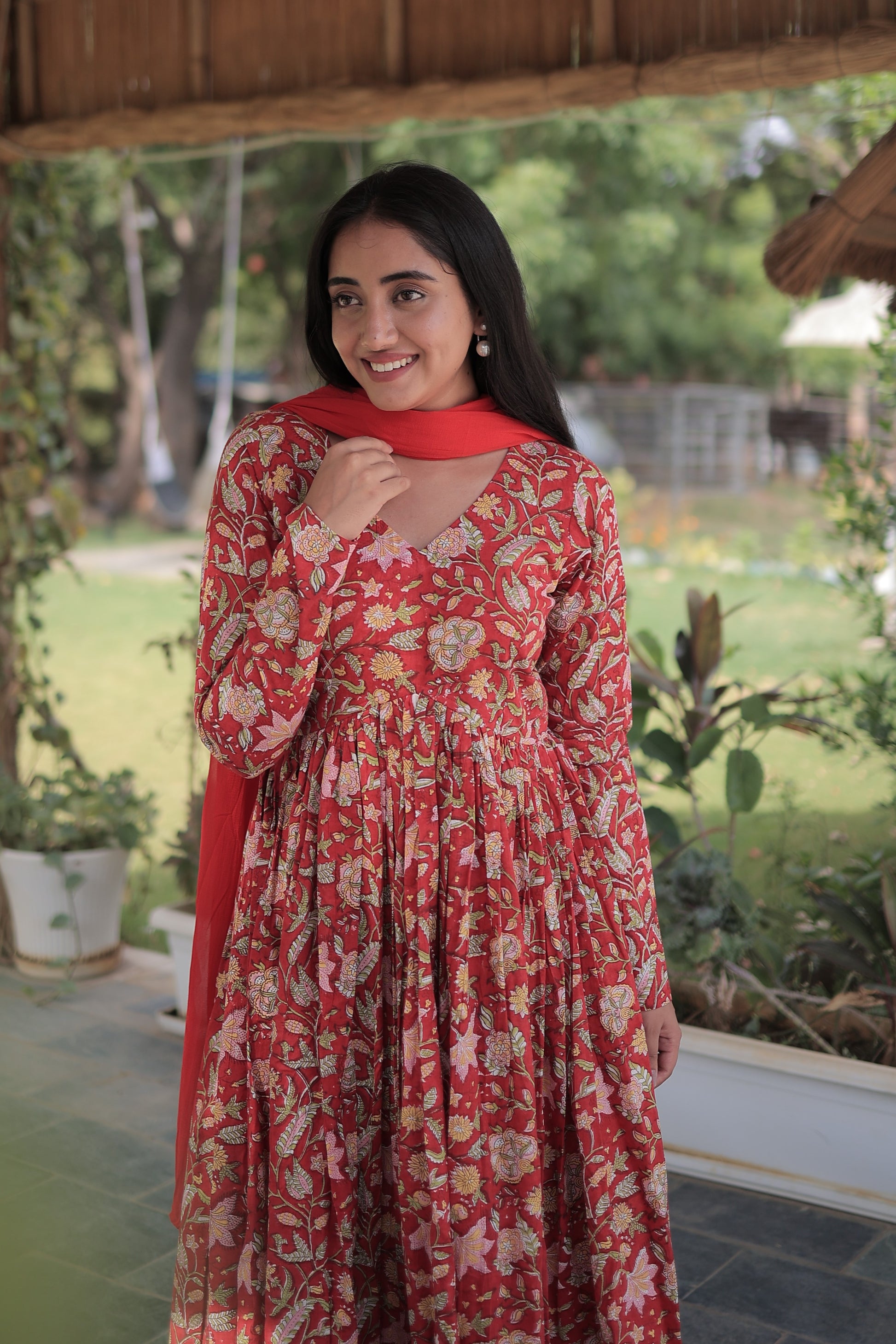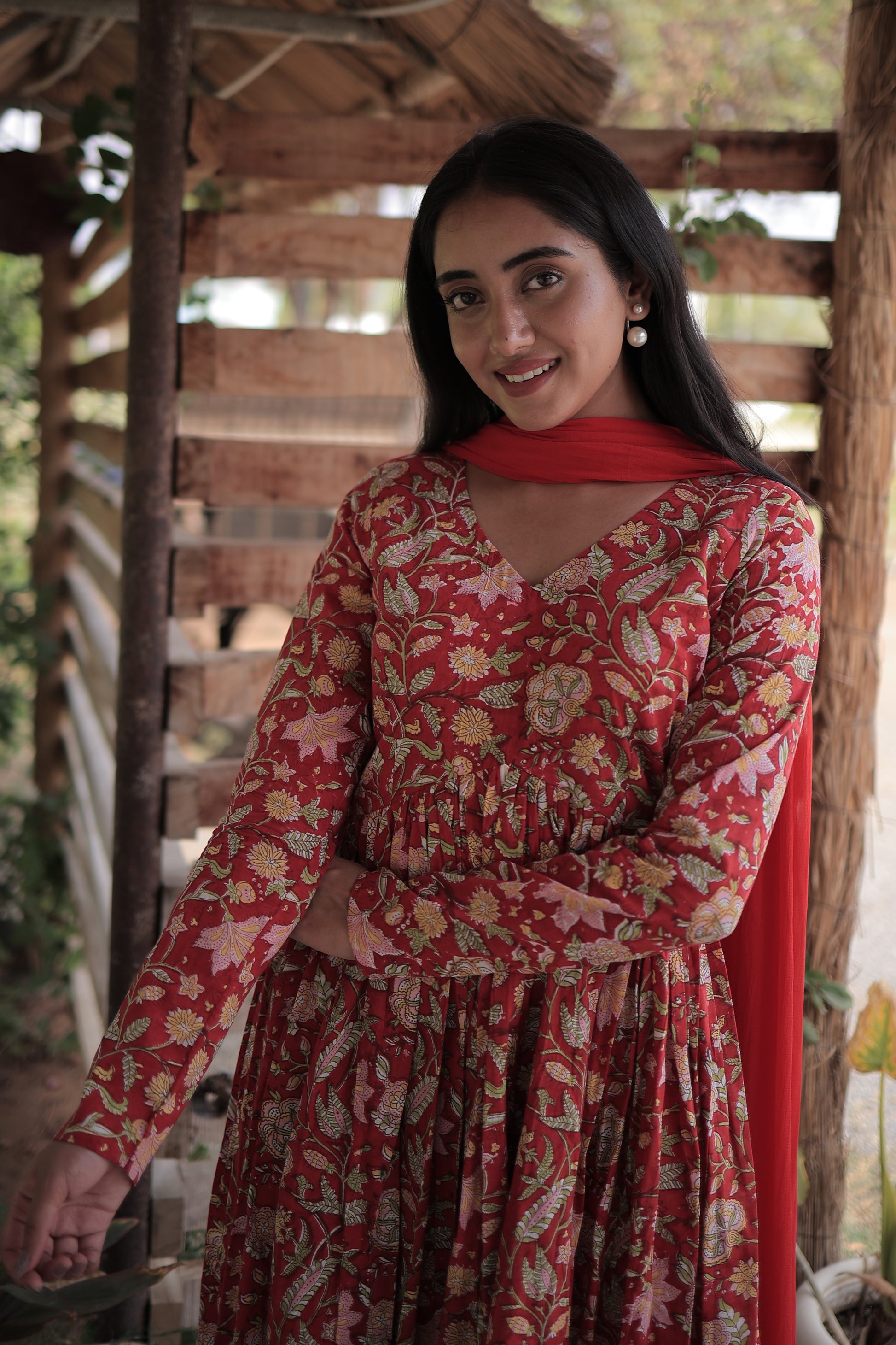 Turn heads in this ethnic suit set! The vibrant red color and stunning floral print are sure to make you stand out. Made with soft cotton, this set will keep you comfortable all day. Perfect for any occasion, this suit set is sure to become a staple in your wardrobe. (Seriously, you'll want to wear it all the time!)