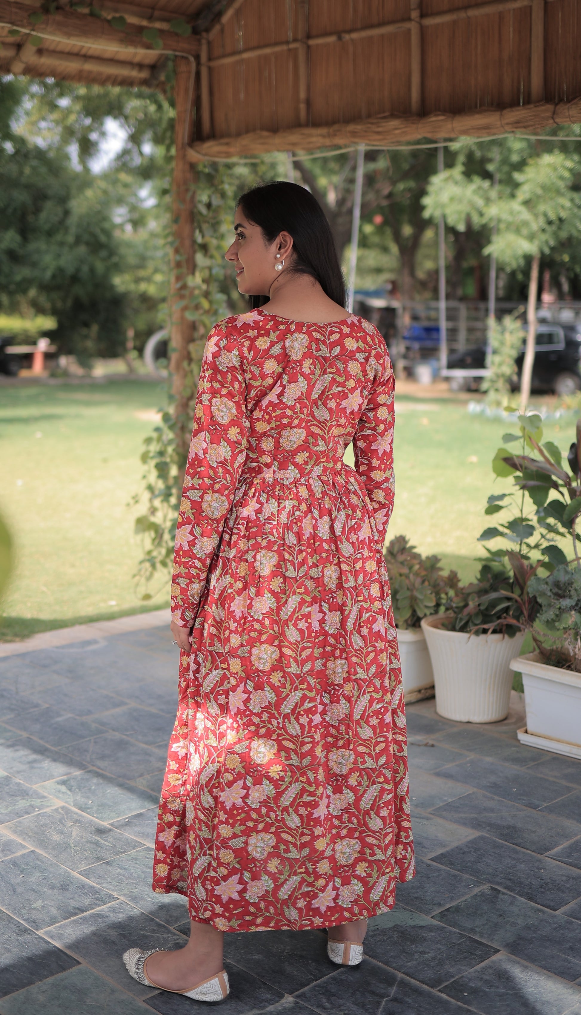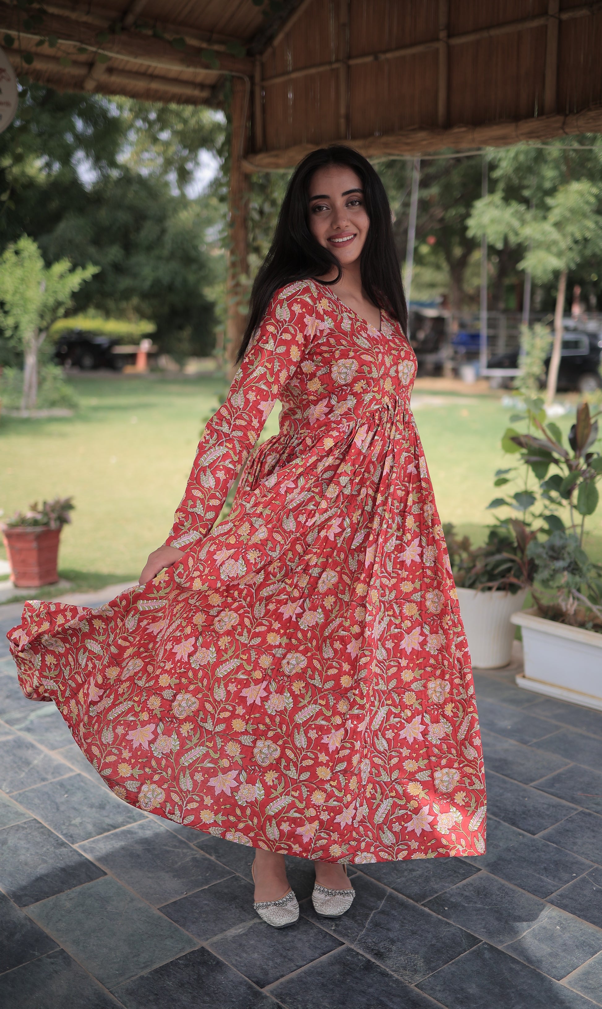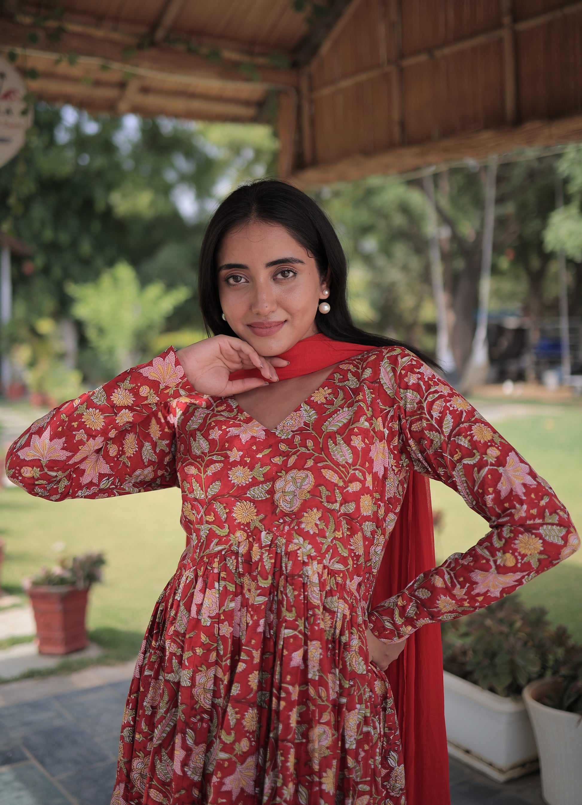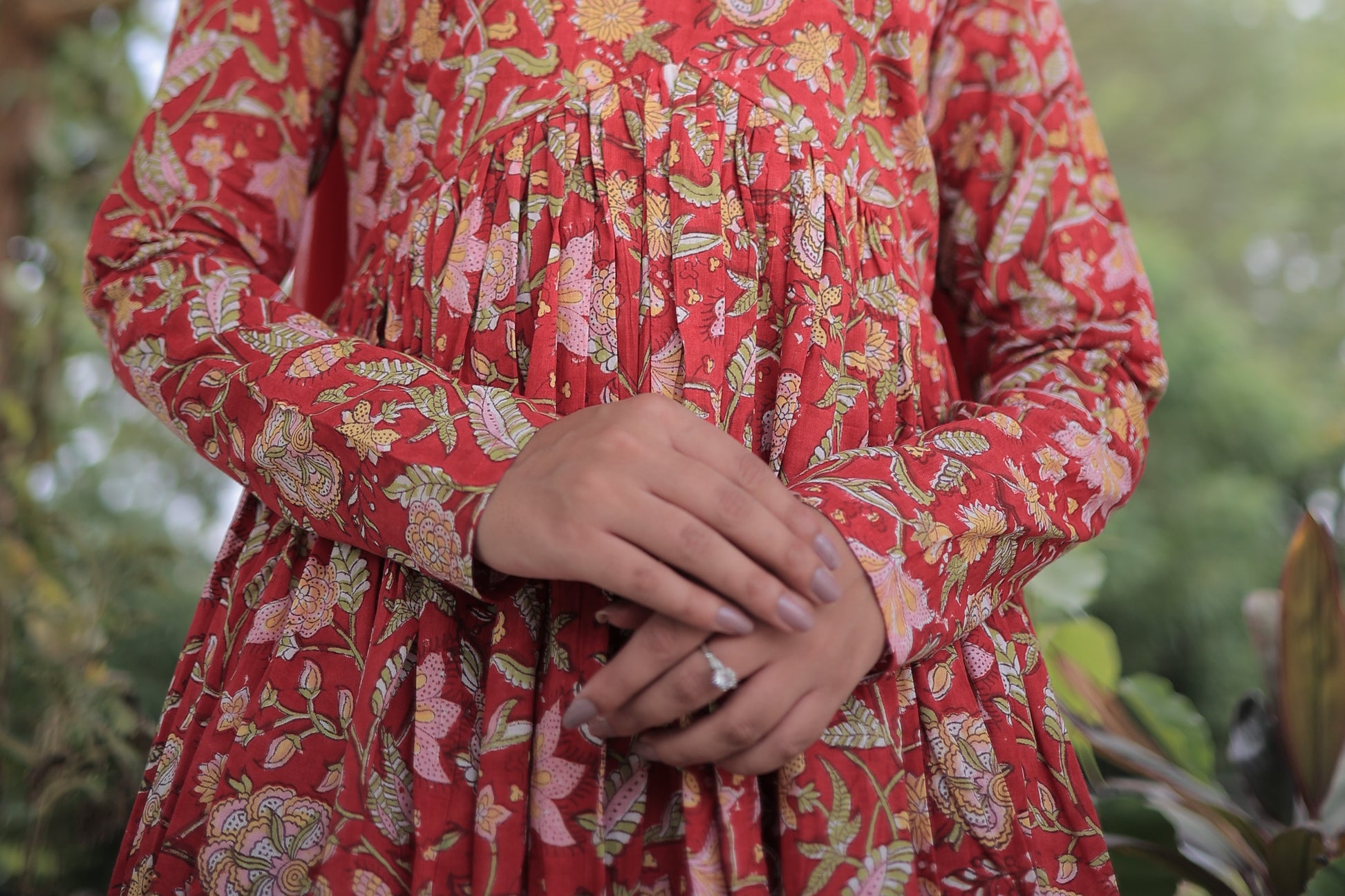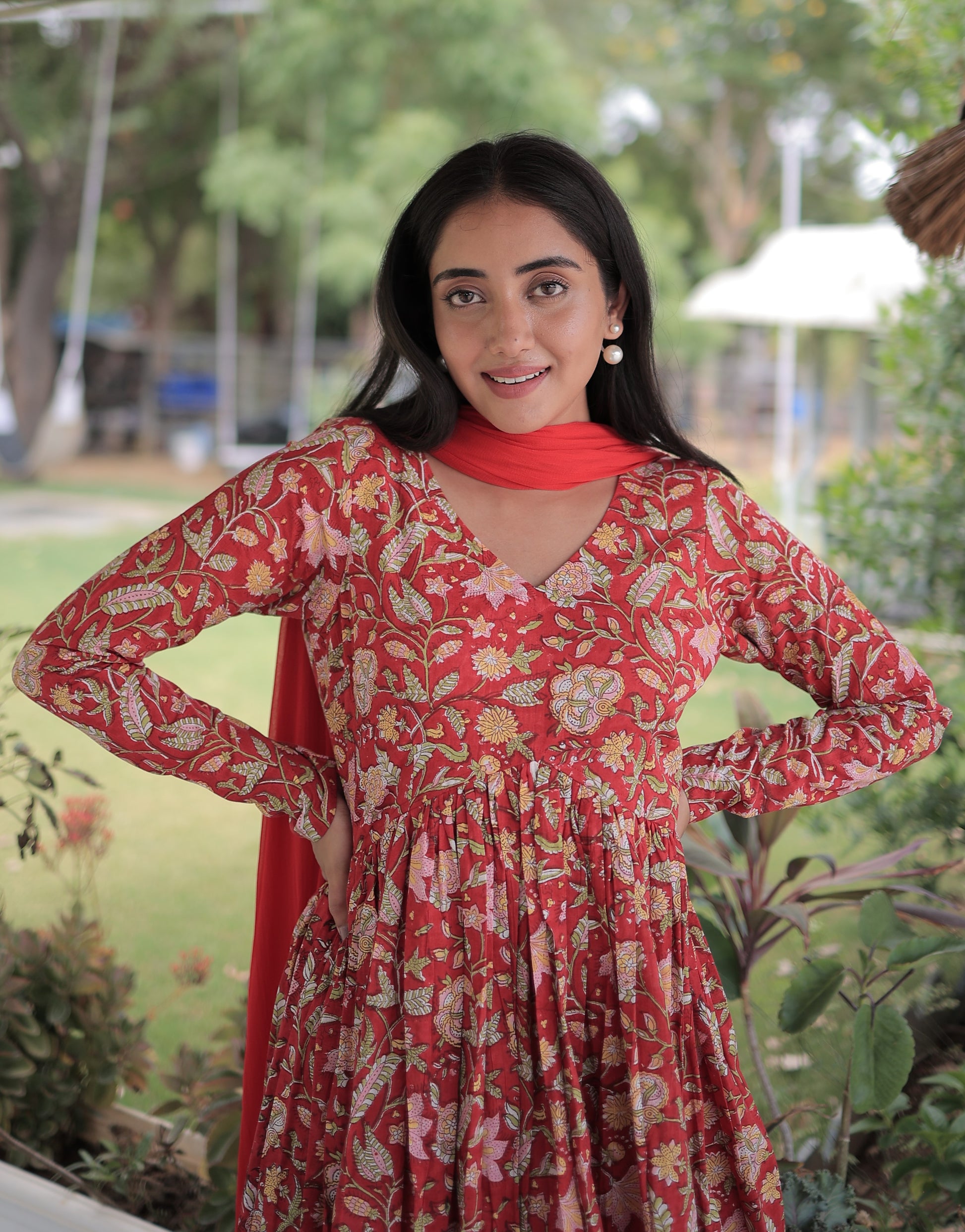 Turn heads in this ethnic suit set! The vibrant red color and stunning floral print are sure to make you stand out. Made with soft cotton, this set will keep you comfortable all day. Perfect for any occasion, this suit set is sure to become a staple in your wardrobe. (Seriously, you'll want to wear it all the time!)