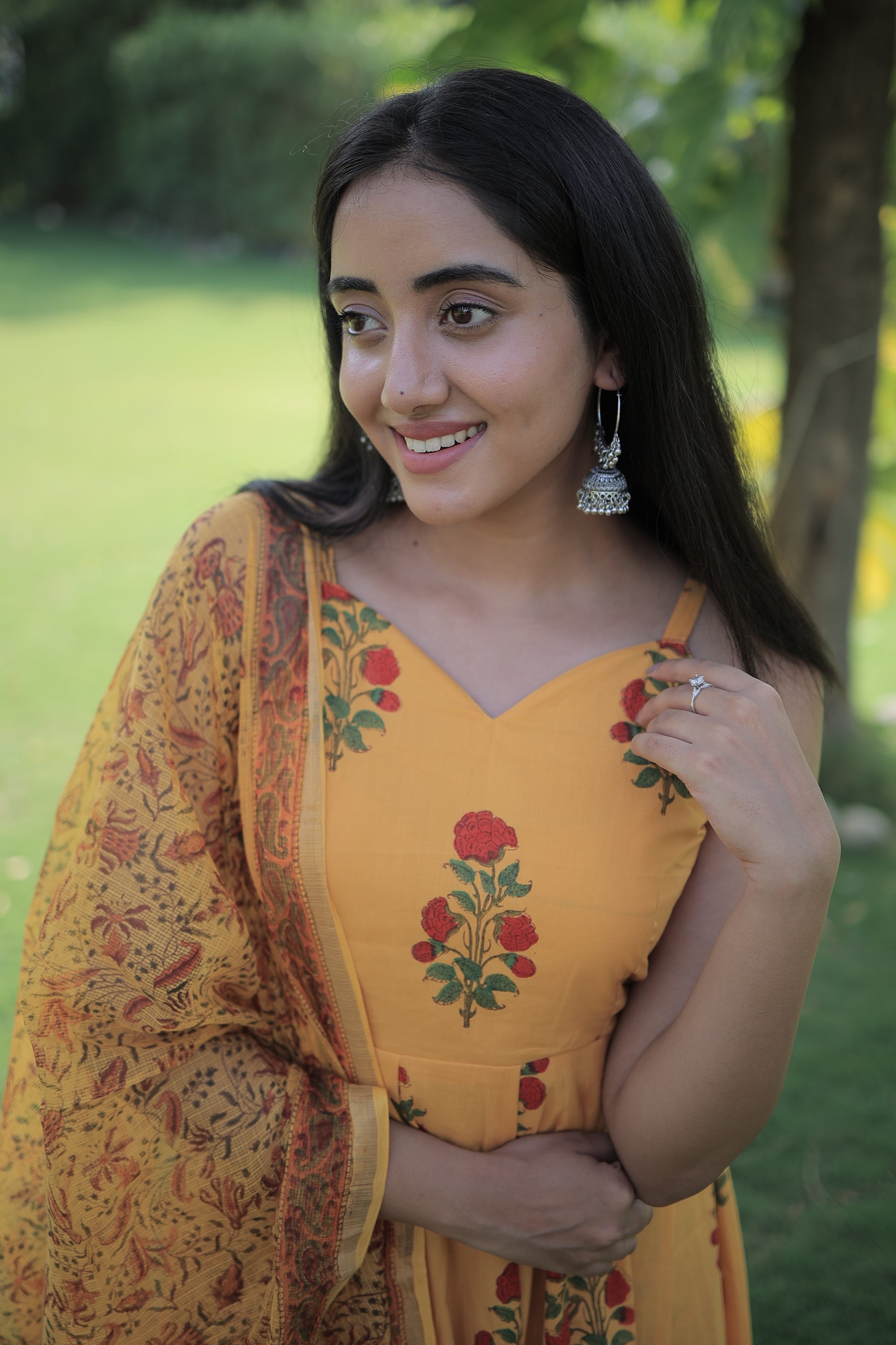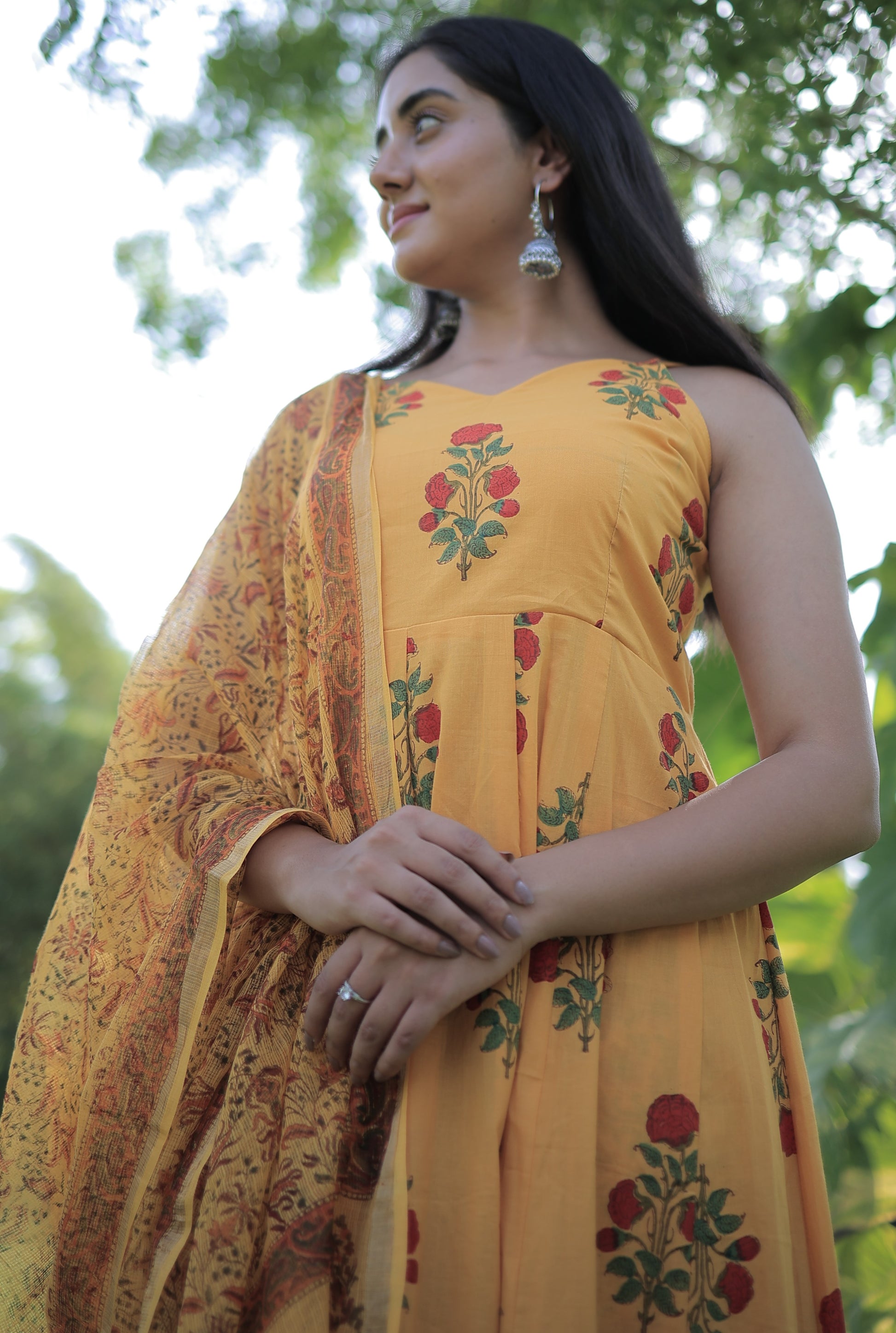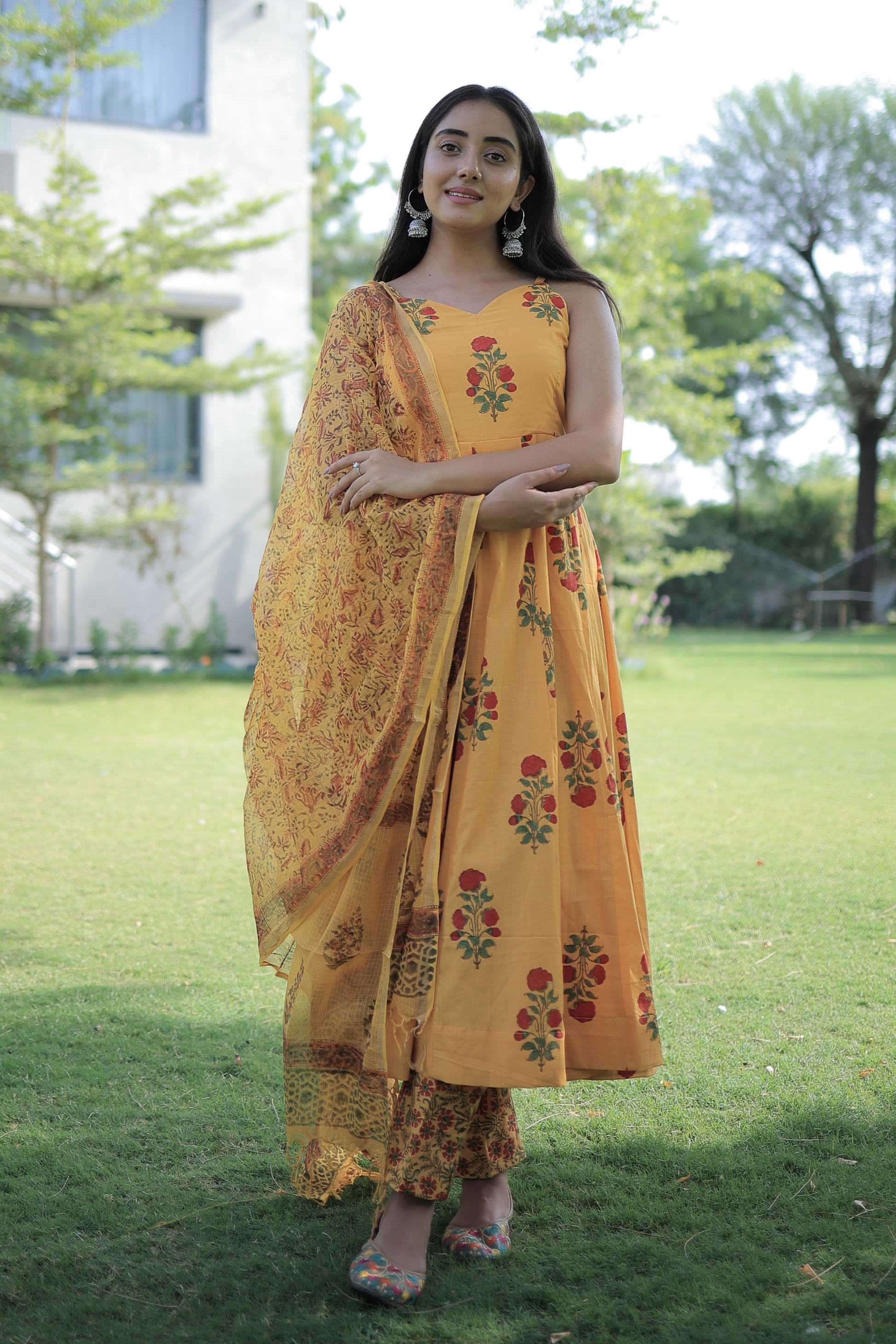 Elevate your style with the ARAJKARO ZOYA COTTON SUIT SET. Featuring a stunning red rose print on a vibrant yellow fabric, this ethnic wear exudes elegance and beauty. Crafted from high-quality cotton, it offers both comfort and sophistication. Perfect for any occasion, make a statement with this gorgeous suit set.